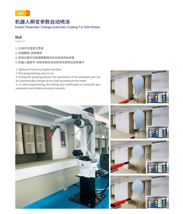 9、可與機(jī)器人配合實(shí)現(xiàn)“參數(shù)跳變式自動(dòng)噴涂”,實(shí)現(xiàn)超越人工的機(jī)器人噴涂。