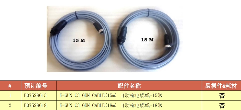 注:E-GUN C3 12米槍電纜采用自動(dòng)粉末噴涂裝置。應(yīng)用程序需要長(zhǎng)電纜應(yīng)該訂購(gòu)可選的槍電纜從上表。